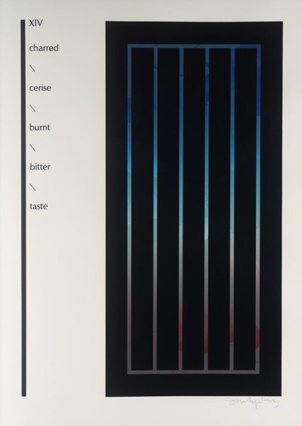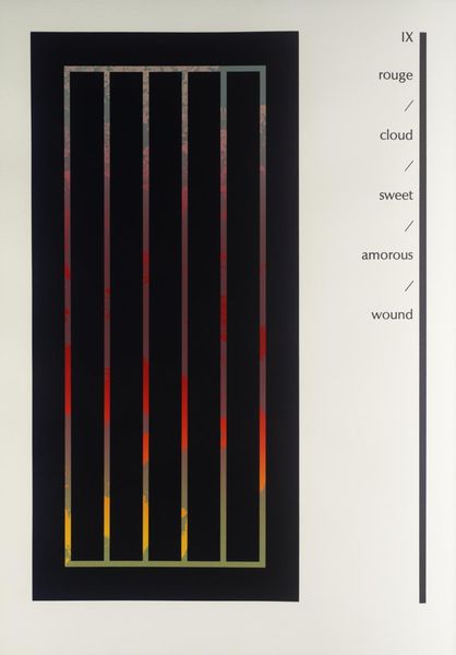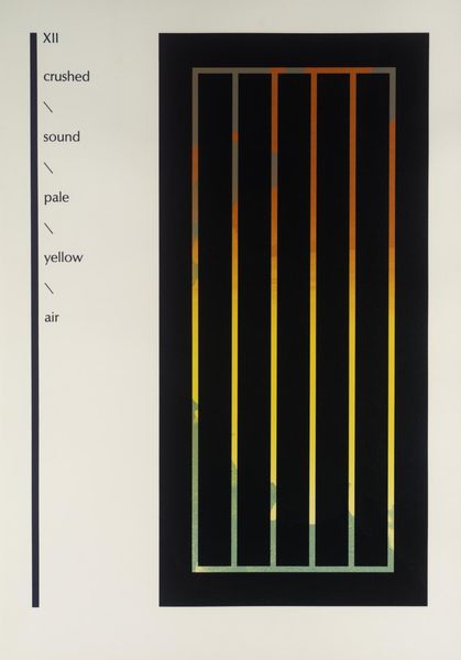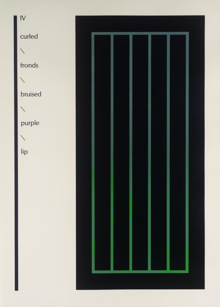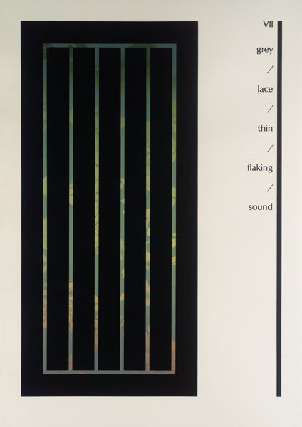 Curator: Ian Tyson, born in 1933, created this work, titled "VI," which currently resides in the Tate Collections. Editor: My first impression is of a somber, minimalist space. Those bars create a feeling of enclosure, like looking through a gate. Curator: The text on the left – 'belled,' 'tree,' 'floral' – feels like a key or an instruction, a way to read the image, perhaps reflecting the artist's engagement with environmental issues. Editor: Yes, and the words are intentionally evocative. The combination of 'floral' and 'music' with the stark visual creates a tension, almost a yearning for something beyond those bars. The vertical lines could symbolize trees and link to other natural forms. Curator: Indeed, Tyson's work often engaged with ecological concerns, responding to anxieties about the environment and the changing landscape. Editor: Ultimately, it's a potent symbol of our complex relationship with the natural world, and the fragility of such things. Curator: I think you are right.