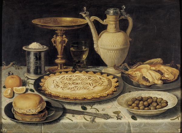 John F. Francis composed this still life painting, "Wine, Cheese, and Fruit," using oil on canvas. The composition is neatly arranged on a white tablecloth that dominates the lower foreground, creating an accessible yet formal setting. Francis employs a play of light and shadow to define the contours of objects, inviting the viewer's gaze to linger over each item. The symmetry achieved with bottles and glassware on either side of the painting, counterbalanced by the asymmetry of the fruit bowl. This tension adds a subtle dynamism to the otherwise orderly scene. Note the horizontal line that divides the composition, balancing the earthly delights with a muted background, creating an intimate viewing experience. This structure creates a discourse on how arrangement and balance in art are essential. Ultimately, the painting’s appeal lies not only in its aesthetic qualities but also in how it engages with the semiotics of everyday objects.