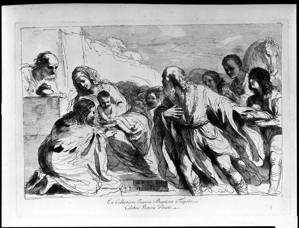Editor: This drawing, "The Prophet Elisha; The Iron Hatchet Made to Swim (after Johann Friedrick Overbeck)" by Ferdinand Ruscheweyh, depicts a rather miraculous scene. What sociopolitical context might illuminate this work? Curator: Consider the era and its relationship to religious authority. Does the miracle performed by Elisha challenge or reinforce existing power structures within the community depicted? How does this narrative play into broader societal anxieties about control and divine intervention? Editor: So, it’s less about the miracle itself and more about what it represents socially? Curator: Precisely. The miracle becomes a tool, a symbol within a larger conversation about power, belief, and societal control. Consider, too, who benefits from the miracle and who witnesses it. Editor: That definitely shifts my perspective. I see how the visual narrative is intertwined with social commentary. Curator: Understanding art in its social context gives us a deeper understanding of its meaning.