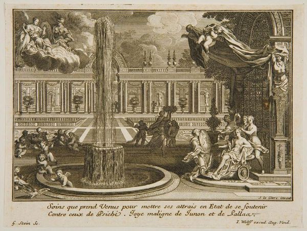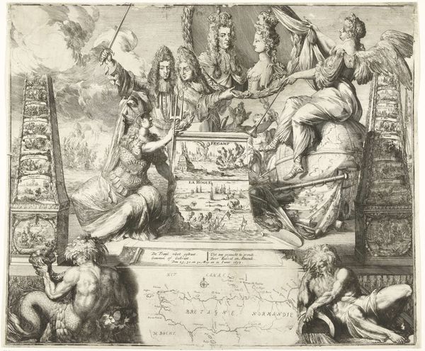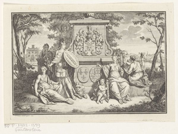 Editor: This is "Mannen en vrouwen kijken in de geopende graftombes van historische personen," or "Men and women looking into the opened tombs of historical figures," an engraving by Cornelis van Dalen I, created in 1655. It has a sort of theatrical mood, like a stage play about death. There are a lot of figures crammed into the space, but somehow it still feels very balanced. What do you see in this piece? Curator: Focusing on the internal structure, we find the composition articulated along a clear horizontal axis defined by the tombs themselves. Note how each tomb is rendered, the varying degrees of detail modulating across the pictorial plane, acting as discrete visual anchors. Are you sensing a similar organization? Editor: Yes, definitely. The eye does jump from tomb to tomb. It’s interesting how the artist gives each one its own kind of weight through detail and darkness. Curator: Precisely. Consider further how van Dalen has managed light. The scene is illuminated inconsistently, with certain figures and skeletal remains highlighted for dramatic effect, yet with no apparent light source. The use of contrasting tones directs the eye and enlivens the composition, creating depth and atmosphere within the fairly rigid structure. Editor: I can see that now. The contrast between light and dark does create drama. But also how that dome like the dark space, on the top center makes the image looks divided in a very theatrical form. Curator: An insightful observation. The upper register serves less to complement than to establish a celestial and divine space, set apart. I also find the integration of text intriguing—little banners of pronouncements. The engraving teases the eye to reconcile word and image. How do you interpret the relationship of textual and representational elements here? Editor: I think it adds another layer. They seem like labels almost, that invite us to think about who is lying inside. That is smart way to see those old bodies, because they don't speak to us anymore! I’m leaving with new eyes toward this piece. I think I can see the importance of details in the dark-light composition in Baroque better. Curator: Agreed. The formal techniques are remarkable, creating powerful tensions that transcend its apparent morbidity.