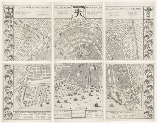 Curator: We're looking at a work called "Plattegrond van Rome," an engraving by Giulio Testone, dating back to around 1670 to 1773. Editor: My initial response is that this evokes a feeling of structured grandeur, and almost scientific detail, while holding a delicate texture created by its aged, monochrome quality. It seems exceptionally detailed, almost dizzying in its precision. Curator: Yes, Testone's engraving beautifully depicts the cityscape of Rome during the late Baroque era. Maps like these are far more than mere directions; they are potent symbols of power, control, and understanding the known world. It serves almost as a declaration of Rome's dominance through visual representation, cementing its cultural and political identity for generations. Editor: From a formal perspective, it is compelling how Testone balances areas of high detail – particularly in the rendering of architectural structures – with the smoother planes that make up areas such as hills. This use of chiaroscuro with line weights and hatching generates volume while emphasizing a contrast between nature and urban development. Curator: Indeed. The very act of creating this meticulous image can be read as claiming Rome, imposing order on its landscape. In the 17th and 18th centuries, having access to and controlling cartography was a status symbol; a privilege. The map’s imagery shaped how people both within and outside the city perceived its reality. It became a shared reference point in collective memory. Editor: I see, the structure and lines give rise to something more—a dialogue, almost, about culture—where technique meets power to build monuments and collective imagination in one artistic, sprawling work. It is through the artist’s meticulous, formal methods that culture lives on. Curator: Absolutely, and I find the layering of history here striking—to consider Rome not simply as geography but as palimpsest of eras, layered meanings. We can see the cultural continuity through these carefully rendered landmarks. Editor: It has been fascinating to consider how close looking can reveal how we see power embodied within art's very infrastructure. Curator: Agreed, and examining its historical implications allows us to reflect upon how the art continues speaking today.