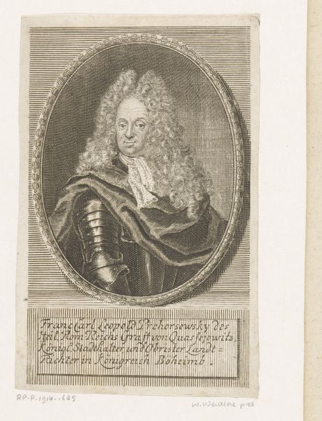 Curator: Here we have a Baroque engraving, a print made in 1728 by Martin Bernigeroth. It's titled "Portret van Johann Zacharias Platner" and is currently held at the Rijksmuseum. Editor: The man practically overflows with privilege. Look at the luxuriant wig! And the way the light catches the folds of his heavy robe... It’s almost tactile, this sense of plushness. Curator: Well, the texture comes from the technique. Think about the process—the careful scoring of the metal plate, the application of ink, the immense pressure required to transfer the image onto paper. Engraving was skilled labor, highly valued at the time. Editor: Absolutely, and beyond the artist's skill, consider the societal function of portraiture like this in the 18th century. It served as propaganda almost, cementing the subject's status and propagating a certain image of power. Who was Platner? And how was Bernigeroth connected to him? Curator: Platner was a professor of medicine, a doctor. Engravings like this allowed his likeness to circulate beyond his immediate sphere. Bernigeroth made quite a living creating these images, feeding the demand for public figures to immortalize their image. Editor: And in terms of material impact, consider the paper itself. Where did it come from? What were the conditions of labor for those producing it? Paper in this era wasn't the throwaway commodity we consider it today. It was a valued product that denoted learning and power. Curator: Right, and prints such as these had political value because images could be reproduced. Disseminating engraved portraits allowed for wider distribution than unique, individual portraits ever would. Think about the message Platner wanted to transmit through the proliferation of his likeness. Editor: He definitely wanted to signal that he had influence. As you said, the act of immortalizing himself via print must be considered within the framework of a society striving for public recognition and demonstrating social control. The politics of imagery were clearly at play here. Curator: Indeed. It's a confluence of materiality, process, social standing and visibility, all etched onto this single sheet. Editor: An intriguing little snapshot of power dynamics made visible through skilled labor and mass reproduction.
