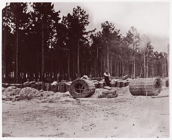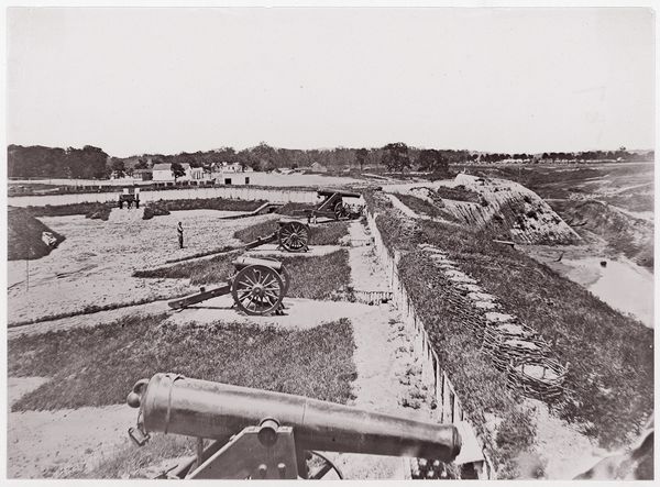 Curator: There's such a raw emptiness here. Makes me feel… unsettled. Editor: This is Timothy O'Sullivan's gelatin-silver print, "Interior of Fort Sedgwick, before Petersburg," taken sometime between 1861 and 1865. Part of a devastating chapter in US history, of course. Curator: Ah, that explains it. It’s not just the monochromatic bleakness; it's the geometry of anxiety. The stark lines of the fortifications, all leading nowhere. What was it like, being in such a landscape, so totally dehumanized? Editor: Indeed. O'Sullivan’s work presents a crucial commentary on the depravity of war. It confronts us with questions about power, control, and the environment it consumes. These are spaces built for domination and defense, stark reminders of the lives that were managed and sacrificed there. Curator: It is more about absence, or maybe a haunting—a silent scream somehow captured in silver. I find myself projecting all kinds of sorrow onto those blank spaces. Were soldiers ever just overcome with, not fear, but ennui and a quiet kind of rage? I wonder if O'Sullivan felt some of that, and how he made it translate into the photo’s overall tonality. Editor: It’s tempting to fall into sentimentality. But I think its critical impact relies on refraining from overt emotional manipulation, rather it relies on factual representation. Look closely at the deliberate framing. The heavy, fortified structures against that pale sky. A composition clearly meant to invoke solemn reflection on what "defending" means. To me, it reveals the machinery of systemic violence as part of our everyday reality. Curator: Hmmm. I don’t disagree at all. But in its realism, maybe we also find a deeper truth, something about our intrinsic, shared humanity reflected back at us… like, what do we want our monuments to be saying about who we really are, at our core? Editor: Ultimately, "Interior of Fort Sedgwick" refuses easy answers. Instead, it invites continued, critical examination. It compels us to confront difficult realities. Curator: Yeah, a space demanding a quiet scream, a requiem, to try and reclaim it for a future we still have a chance to build.