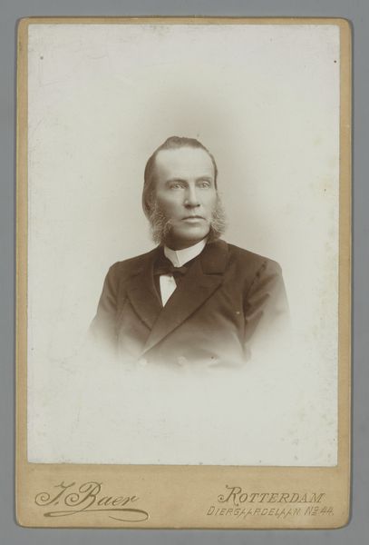 Curator: This gelatin-silver print, titled "Portrait of an Unknown Man," was created by Willem Gerhardus Kuijer, likely between 1862 and 1899, and currently resides in the Rijksmuseum. Editor: What immediately strikes me is its quiet dignity—that somber sepia tone feels so perfectly fitting for an era where capturing a likeness was a truly special event. The subject’s gaze is just off center, avoiding direct eye contact. Curator: Precisely! He almost seems caught between worlds, doesn’t he? The averted gaze could speak to a certain reserve or perhaps even a carefully constructed pose to project a certain image. Back then, photography was becoming more accessible, yet it retained this air of formality and importance. The oval framing reinforces this, reminding us of painted miniatures and classical portraiture. Editor: The mottled surface lends it an antique air, which, ironically, almost modernizes it. There’s something timeless in that imperfect beauty, echoing the wear and tear of memory itself. Tell me, what can you deduce from his clothing? The stark white collar poking up… Curator: The attire, the cut of his jacket, it's all hinting towards middle class aspirations, but in such a low key, typically Dutch manner. A symbol for the merchant or clerk classes who had both means and time to present themselves in the photographic studios that had appeared across cities. But the lack of more obvious adornments is striking in itself – he's projecting perhaps integrity and diligent pursuit, or attempting to climb in the societal classes. Editor: It really gets you wondering about the man behind the image, his untold story. What he hoped for, what he feared... The photo doesn't give everything away, in fact leaves much more unsaid. The ‘unknown’ adds an additional layer of fascination, turning this single face into a mirror reflecting universal experiences and the yearning for recognition, which we still relate to, regardless of when we existed. Curator: A fitting note to end on, reminding us that art, like life, often finds its power in the unsaid, the unseen, and the eternally mysterious. Editor: It serves as a potent reminder that the search to unveil human stories has infinite roads. Even looking at a quiet face frozen in time as an opportunity to explore, ponder, and interpret life.