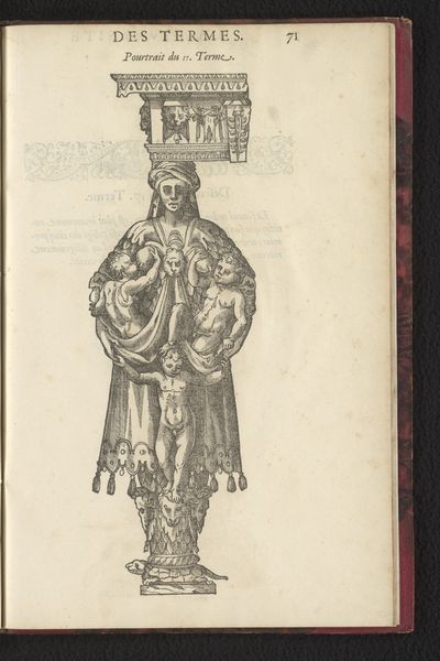 Curator: Take a look at this page from a book titled "La Diversité" featuring a "Term in de vorm van een mannelijke sater," created around 1572. It is rendered through print and engraving. Editor: Immediately, the swirling figures suggest a sense of frenetic energy. A strange, chaotic beauty in its swirling forms... are those satyrs? Curator: Precisely! Notice how the artist employed engraving to articulate texture. The use of line suggests an interest in form and detail, hallmarks of Mannerism. This era, obsessed with refinement, would produce pieces concerned with virtuosity. Editor: Yes, it evokes classical forms but amplifies them to the point of exaggeration. I see symbols of debauchery in the satyr, an abandonment of control. This visual representation pulls from established tropes and yet transforms into something new, perhaps reflecting shifting cultural attitudes toward those symbols at the time. Curator: These printed images also became widespread with the advent of reproducible processes. Printmaking at the time involved immense material processes, each phase employing workshops, assistants, and specialists—the division of labor created these intricate designs to circulate ideas. Editor: You’re right, knowing it’s a print influences my perspective. The image’s symbolic power increases through wider dissemination. Were these images intended to provoke conversation or act as emblems for broader ideas about nature and humanity? Curator: Likely both, though understanding their specific place within the broader discourse of the late 16th century remains crucial. It invites further examination of both workshops of this time and the place that the image occupies culturally and symbolically. Editor: I appreciate learning more about the context in which these images were produced. It adds another dimension to how we understand the symbols depicted here.