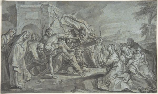Editor: This drawing, "Martyrdom of Saint Andrew," dates back to sometime in the 17th century and the artist is, unfortunately, anonymous. The sketch, in pencil, presents a harrowing scene, doesn't it? How do we begin to interpret the layers of historical and cultural context woven into this piece? Curator: Indeed. The scene itself offers a glimpse into the public spectacle of religious martyrdom, a potent tool in shaping religious and political landscapes of the time. What strikes you about the crowd’s reaction? Editor: There’s a real mix of emotions, or maybe a lack thereof? Some seem distressed, others detached, almost like bystanders at an official event rather than witnesses to someone's execution. Curator: Precisely. Consider the socio-political function of such depictions. The Church, or other powers, often commissioned such art. The visual narratives of martyrdom reinforced societal control and the acceptance of established authority by dramatizing consequences and projecting moral righteousness. Notice how the artist has staged Saint Andrew in a way that encourages our gaze. Editor: It’s like the drawing wants to invoke certain feelings, fear or awe. Do you think art like this truly moved people, or did it mainly serve the interests of the powerful? Curator: It’s a complex interplay, isn’t it? While these images could incite religious fervor and obedience, they might have also been seen as propaganda by some. Examining the ownership history of similar works – who commissioned them, where they were displayed – gives clues about the intentions behind their creation and the social function they served. The 'academic art' style in the tags highlights this aspect even further. It underscores that its purpose might have been as a social tool as well as artistic statement. Editor: So, by exploring its history, its commissioners, and its audience, we get a much fuller picture of the drawing itself and how art operates in society? Curator: Exactly! It transforms from a simple drawing into a window onto the power dynamics of its time. Editor: I see it now; the martyrdom isn’t just the subject; it’s part of a bigger story about how art shapes and reflects society. Thanks for pointing that out.