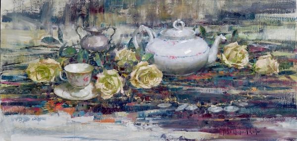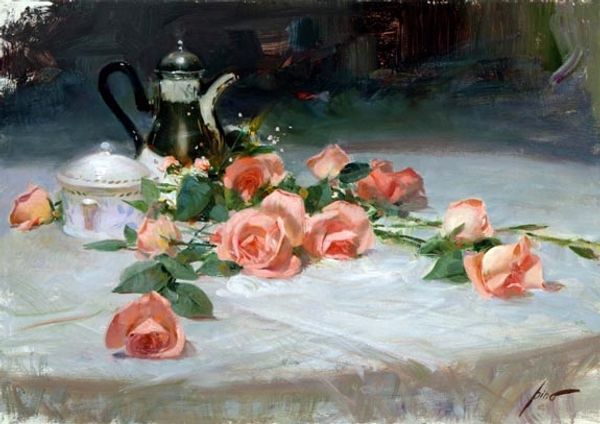 Dmitry Nalbandyan made this painting, Morning Breakfast, probably in the 80's, with oil on canvas. You know, looking at it, I think this is what painting is all about - a process of seeing and responding. The texture here is yummy, thick and juicy, especially in the cherries. Look at the tablecloth, how the blues and whites mix and dance, creating a rhythm that your eye can follow. The way the light hits the metal of the tea pot - a real balancing act between capturing the light and just slapping it on the canvas. What I love most is how each object is given equal love and attention, how they are all sat down together at this table in paint. Nalbandyan reminds me of someone like Fairfield Porter, who also found a way to find the extraordinary in the ordinary, turning a simple breakfast into a symphony of colour and light. Ultimately, it's all about the questions the art provokes, the conversations it starts, rather than any easy answers it might offer.