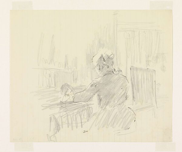 Editor: So, this is Jean-Louis Forain's "Breakfast (horizontal plate)," created in 1895 using pencil as a print and drawing medium. It has a definite air of quiet contemplation about it. What catches your eye when you look at it? Curator: The immediate intimacy of the scene grabs me – the soft hatching of the pencil lines almost whispers. It's a private moment, a woman in bed, attended to perhaps. There's an impressionistic quality to it, blurring the edges, almost dreamlike, yet with such crisp details when you peer into its world. Notice how the light defines form, especially the drapery. Do you sense a particular narrative or feeling being evoked? Editor: I do. A gentle, caring one perhaps. The standing figure's presence feels very deliberate and considered, like they are being careful not to disturb the woman in bed. Is it the woman's social role? Curator: Maybe both? This piece has a casual style but feels quite emotional to me, very impressionistic, focusing on capturing fleeting light and a mood of interiority more than solid representation. How do you think Forain uses the lack of strong lines to emphasize that interiority? Editor: It blurs the setting and softens everything, kind of giving this cozy environment that emphasizes personal care... like the focus is truly on the people and their dynamic together! Curator: Precisely! He's capturing an emotion as much as a scene. It's in these subtle artistic choices that the drawing comes alive, inviting our reflection on everyday relationships. The soft pencil really helps us feel more engaged with it! Editor: Absolutely, I get that! Thanks, I wouldn't have looked so much into detail otherwise. Curator: Anytime! Seeing it like this helps us understand a little more of Forain. A lovely work to muse over!