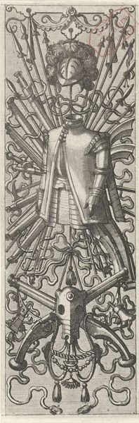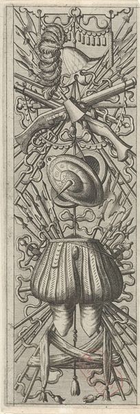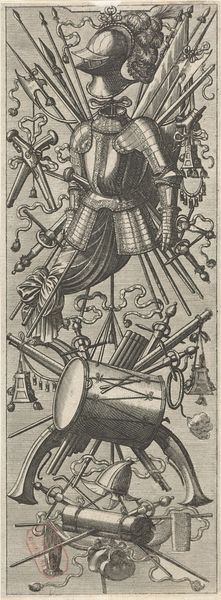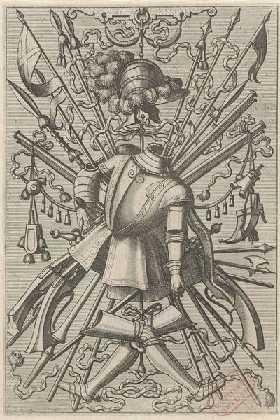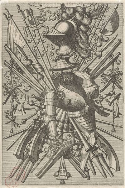 This is “Wapentrofee, harnas,” an engraving by Johannes or Lucas van Doetechum, housed at the Rijksmuseum. Imagine the cultural context of this piece, where military prowess and nobility were intrinsically linked. This artwork, composed solely of weaponry, speaks to the era’s obsession with martial power, reflecting the socio-political structures of the time. The detailed armor and array of weapons aren’t just objects; they are symbols of status, gender roles, and control. The armor, in particular, represents an ideal of masculinity associated with war, honor, and a specific class identity. Consider the historical backdrop of constant conflict. The armor becomes a second skin, defining the wearer's identity and role in society. The image lacks a human presence, yet it evokes the weight of responsibility and the burden of expectation placed on those who bore arms. The artwork reflects and shapes societal views on power, gender, and identity. It serves as a reminder of how deeply embedded these values once were, inviting reflection on how they have evolved, or perhaps, remained with us.