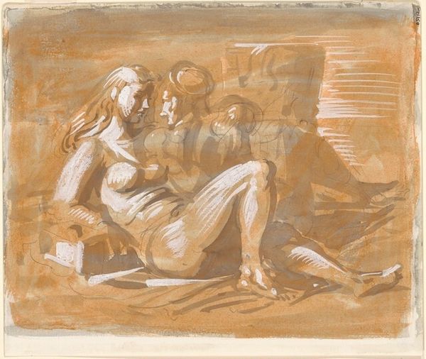 Curator: Here we have "Madonna and Child with Saint John," an evocative drawing whose author remains unknown. It resides in the collection of The Art Institute of Chicago, inviting contemplation. Editor: My immediate reaction is to the mood it conveys. There's a strange, muted sweetness. It's tender, but something about the sepia tones lends it a quality of distant sorrow. Curator: Let’s delve into the formal properties. Notice the layering of ink, chalk, and tempera on paper. The artist demonstrates considerable facility with line. See how a few quick strokes render form? The composition is relatively stable despite the figures’ dynamic poses. Editor: Precisely! The gestures of the children hold profound significance. St. John’s embrace speaks to adoration and, perhaps, premonition, while Christ holds a tiny cross – the symbol of sacrifice central to Christian belief. Curator: From a structural perspective, consider the strong verticality of the Virgin set against the dynamism of the putti, offering spatial complexity within a very economical presentation of the subject matter. Editor: And the iconography doesn't end there. Even Mary's slightly downturned gaze and enclosed pose represent humility and a sense of burden. Her representation, particularly in Italian Renaissance art, speaks of her dual role as queen of heaven and mother of sorrow. The artist, although unknown, obviously had a profound familiarity with religious symbols. Curator: Undoubtedly. And while we may not know the artist's name, their manipulation of line and shadow certainly deserves admiration for how they achieve spatial and atmospheric effects. Editor: It reminds me how art often bridges the space between personal sentiment and collective cultural understanding, doesn’t it? It reminds us of how human feeling is so very beautifully encoded in religious traditions. Curator: I find that considering the materiality and composition enhances my appreciation for the skill in realizing what are commonly held to be deeply personal ideals. Editor: Yes. Art like this makes those old stories perpetually new.