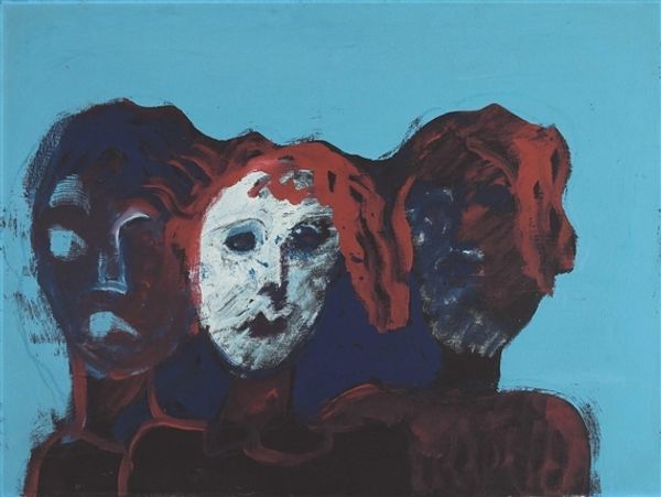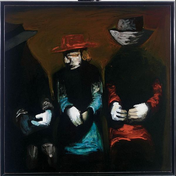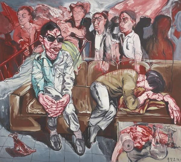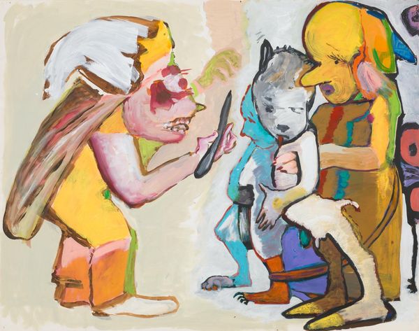 Editor: So, this is "Dark" by Eduardo Berliner, painted in 2013 using oil on canvas. It strikes me as rather unsettling... there's a palpable tension in the air, and I can't quite put my finger on why. How do you interpret this work? Curator: The unsettling feeling comes, I believe, from the jarring combination of familiar imagery with unsettling symbolism. Consider the figures. What are their faces telling you? What feelings or ideas might they represent? Editor: Well, their eyes… they’re blank, almost absent. It makes me think of a loss of innocence, or maybe a detachment from reality? The masked figure seems like a menacing authority figure. Curator: Precisely. Berliner uses masks, blurred features, and pale skin tones. This generates psychological disturbance and unease by defamiliarizing elements we typically associate with comfort and recognition. Masks can conceal identity, or become it; consider what other animals are presented to us in this scene. Do you see similar things happening in this work, or ways it seems to subvert conventions? Editor: The dogs seem like corrupted versions of loyalty, perhaps? They’re being impaled, being leaned on and in one case appear to be eating human flesh, which is extremely disturbing.. This juxtaposition of youth and these surreal acts feels loaded with a disturbing undercurrent, a kind of... forced maturity or corrupted innocence. Curator: Exactly. He disrupts the perceived harmony, showing not a simple world, but one fraught with tension and, as you noticed, corruption. He brings an innocence together with darker truths, things perhaps best left untouched, yet are forced upon one none-the-less. Think on the works of Neo-Expressionism here... It shows how symbols themselves carry complicated histories that seep into the present. Editor: This conversation’s given me so much to consider—the way the symbols play off of and against each other is both disorienting and incredibly effective. Curator: Yes, the defamiliarization pushes us to confront our own assumptions about how the world ought to be. We see how symbols, when re-contextualized, invite new and challenging understandings.