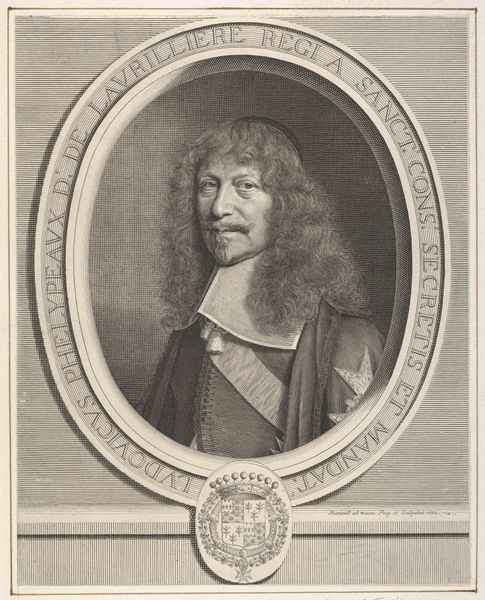 Editor: This is Robert Nanteuil's portrait of Louis-Phélypeaux de la Vrillière. It's an engraving. The detail is incredible. What do you see in terms of the process used to create this image? Curator: Look at the lines, the textures achieved through the manipulation of the metal plate. Consider the labor involved in creating this multiple, and how that makes the image available for consumption. Was it meant to elevate Vrillière, or simply document him? Editor: So, you're saying the materials and production methods have social implications. How were these prints consumed? Curator: Exactly. These were likely distributed among Vrillière's circle, reinforcing his power and status. The very act of commissioning and circulating such a portrait speaks to the social dynamics of the time. What do you make of the frame around the portrait? Editor: It does seem to box him in, maybe reinforcing his status, but also containing him somehow. I never thought about prints in this way. Thanks!