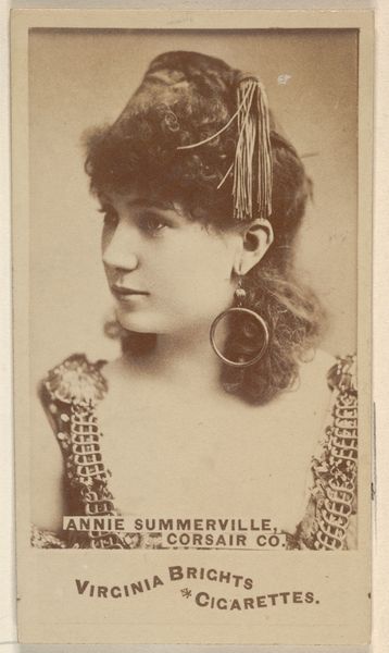 Editor: This is an albumen print photograph, probably dating from around 1870, by Jeremiah Gurney. It’s titled "Untitled [portrait of an unidentified actress]". What strikes me most is how different the photographic conventions were then compared to today – this feels much more like a genre painting somehow. How do you interpret this work? Curator: Immediately, the sitter's downcast gaze conveys a sense of introspection. Notice the precise details – the ornate hat, the striped fabric, and that intriguing earring. What feelings do these details evoke? This isn't merely a record of appearance; it seems to tap into deeper societal anxieties about identity and performance, particularly for women in the performing arts during this era. Editor: That’s interesting. I hadn’t thought about societal anxieties. The outfit feels performative but somber. Are there other symbolic clues we might be missing? Curator: The downcast eyes, almost veiled by the hat’s shadow, could represent the societal pressures faced by actresses – the scrutiny and the desire for privacy amidst public life. This type of portrait served not just as personal keepsakes, but also became a form of marketing and identity construction, embedding complex symbolic codes about the subject's perceived social and moral status. The jewelry, simple as it seems, could signal economic status, taste, or even a deliberate artistic choice on her part. What about the bow at her chest? What sort of message would that communicate to someone at that time? Editor: I suppose the bow would symbolize a level of refinement and respectability for a public figure. It seems like this image functions as both a personal memento and a careful presentation of self for public consumption. Curator: Precisely. So, reflecting on this work, what aspects resonate most with you now, given our discussion? Editor: Definitely the understanding that what seems like a simple portrait holds such deep layers of symbolic meaning, reflecting anxieties and carefully constructed identities. Curator: I agree. Photography in the 19th century served as a potent vehicle for shaping perceptions, embedding cultural values and influencing societal memory.