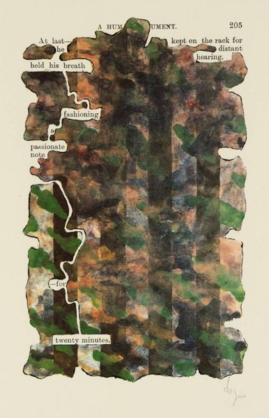 Editor: This is Joe Tilson’s "Oak Oracle." It looks like a print, featuring rows of oak leaves and a handprint. It reminds me a bit of botanical illustrations, but with a much rougher, more handmade feel. What strikes you about this work? Curator: The silkscreen process is crucial here. Tilson’s choice to reproduce oak leaves, a readily available material, challenges traditional notions of artistic creation. Consider the labor involved in gathering, preparing, and printing these leaves. It’s about bringing the outside world into the gallery space, isn't it? What do you make of the hand? Editor: That's a great point. I hadn't thought about the labor involved. I guess the handprint reinforces that idea, connecting the artist's body directly to the work. Thanks, that helps me see it differently!