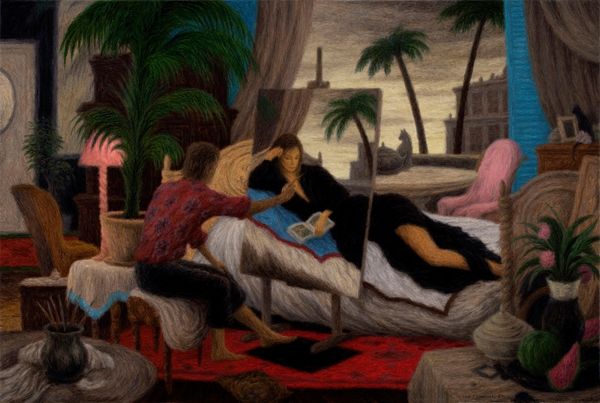 Iwo Zaniewski painted this work, Painter in a Red Shirt, using traditional methods and materials. Its flat perspective and careful application of paint emphasize the materiality of the painting, turning our attention to the artist’s labour and the production process. The artist uses tiny strokes to create texture, in a way that appears almost woven. This evokes handcraft aesthetics, contrasting with the scene depicted, which shows all the trappings of wealth and luxury. The painting shows the artist at work, and is in a way a celebration of work. It reminds us that no matter how rarefied and elite the art world may seem, it all boils down to the application of skill and effort. This piece challenges the conventional separation of 'high' art from 'craft' by foregrounding process and labor within a scene of apparent leisure and luxury.