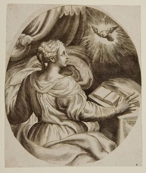 Giulio Bonasone created this engraving of the Annunciation in Italy, sometime in the mid-16th century. The scene depicts the angel Gabriel, here in the form of a dove, telling Mary that she will bear the son of God. Bonasone's work was produced in an age of religious upheaval. The Catholic Church was still the dominant institution in Italy, but the rise of Protestantism in other parts of Europe challenged its authority. Images like this one played an important role in reaffirming Catholic doctrine. The figure of Mary was particularly important to the Church, as she represented the possibility of divine grace working through human beings. Historical research into the social and institutional context of this image – the history of the Catholic Church, the role of art in religious devotion, the development of printmaking as a medium – can help us to understand its meaning and significance for its original audience.