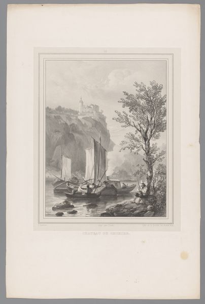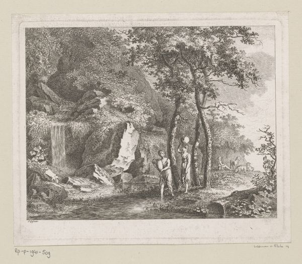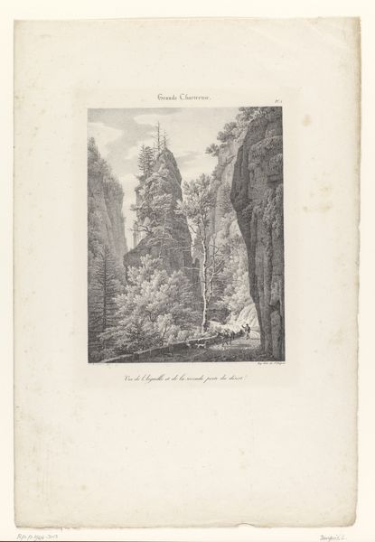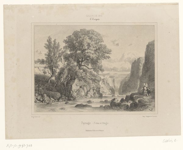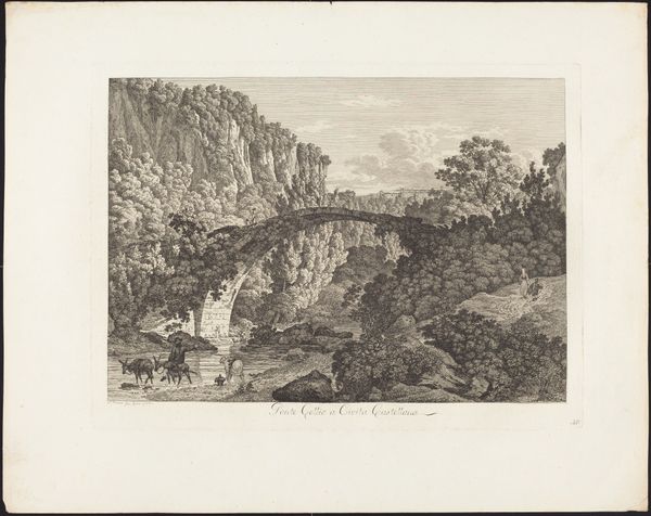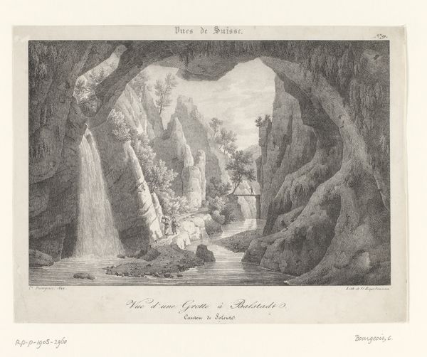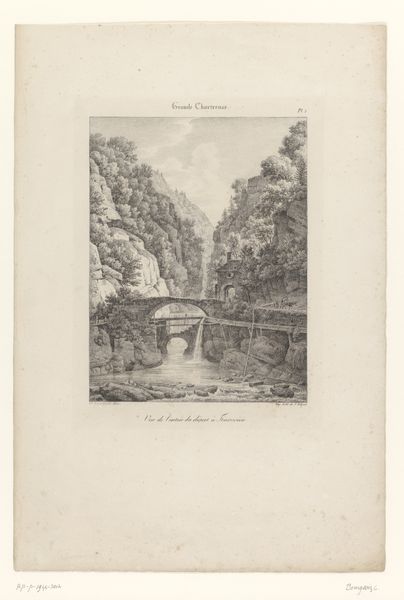 Editor: This is "Grotto of a Hermit in the Ravines near Sorrento," a drawing and engraving made between 1824 and 1826 by Alexis-Victor Joly. It feels so…remote. A bridge connects what seems like two sides of a divide, and there are people walking towards a mysterious cave. What do you make of this piece? Curator: It's fascinating to consider this work within the Romanticism movement. Think about the emphasis on individualism and the power of nature that characterized that period. What narratives do you see here in terms of isolation and spiritual refuge? How does the representation of the human figures, almost dwarfed by the landscape, speak to the relationship between humanity and the environment during a time of increasing industrialization? Editor: I see what you mean. The people are tiny in comparison, like nature is so much bigger and more powerful. The setting feels deliberately separate from everything else. Almost like it is meant to invite us into a different world? Curator: Exactly. Now consider how this "hermitage," this intentionally isolated space, intersects with gender. Who historically had access to such spaces of retreat, both physically and mentally? What possibilities might a landscape like this represent, particularly for women during that time? Perhaps the idea of solitude was a gendered privilege? Editor: I had never thought about that before. It is possible that this space, the artist’s romanticized ideal, could not necessarily be experienced by everyone, because of their gender, social status or race? It's so important to consider who is included and excluded in artistic visions. Curator: Indeed. These landscapes are never neutral. By asking who gets to occupy and benefit from the ‘romantic’ isolation represented in art, we can see power dynamics reflected. This helps us consider both historical contexts and current systems. Editor: This has really shifted how I view not just this artwork, but landscapes in general. There is an encoded politics there that I hadn’t fully understood before. Curator: And hopefully inspires you to question, excavate, and connect seemingly disparate elements for a more inclusive and accurate history.