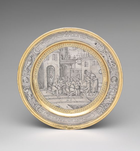 Editor: We're looking at an oval silver bowl, partially gilded, dating back to between 1675 and 1700. It's quite ornate, with what looks like an interior scene and portrait medallions around the rim. What strikes me is its grandeur, almost like a miniature historical stage set. How do you interpret this work? Curator: I see it as a powerful articulation of authority and memory. The material itself, silver and gold, speaks to wealth and status. The historical scene, coupled with the portraits, likely depicts an important political or intellectual lineage. This bowl wasn’t simply decorative; it was a statement. Editor: A statement of what, exactly? Are these Roman emperors, perhaps? Curator: Possibly. And that's precisely where the activist reading comes in. Who is being memorialized, and whose stories are being erased? Consider the power dynamics inherent in depicting specific historical figures, particularly men, while excluding others. It upholds certain values and reinforces a patriarchal narrative. The opulence becomes a form of cultural gatekeeping. Editor: So, the bowl isn’t just beautiful; it’s actively participating in a historical conversation? Curator: Absolutely. And that conversation extends to its contemporary reception. How do we, as modern viewers, engage with objects that celebrate potentially problematic histories? Do we critique, contextualize, or simply appreciate the craftsmanship? Editor: I never thought about a bowl having a political viewpoint! Curator: Precisely! Art isn't created in a vacuum. By examining the social context and the power structures at play, we can unlock richer understandings. Editor: That gives me a lot to think about, especially in how we present history in museums. Thanks!