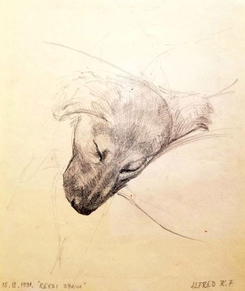 Alfred Freddy Krupa drew “The portrait of Ben” with pencil. Look at how he layers the graphite, one stroke building on another, to create the form of Ben's head. It’s like he’s feeling his way around the dog's shape, not just copying it, but really getting to know it. The texture of the pencil on paper gives the drawing a soft, almost dreamy quality. It's not about sharp lines and perfect details; it's more about capturing a feeling, an essence. Notice the little dog jumping over the square hurdle, it’s a playful touch, a little secret hidden in the composition. It makes you wonder about the relationship between the artist and this dog named Ben. It reminds me of drawings by Giacometti, that same sense of searching, of never quite arriving at a fixed image. Art is always a conversation, right? It's never really finished, just a moment captured in time.