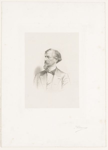 Editor: This drawing, "Portrait of a Man, possibly Drion," is attributed to Jean-Baptiste Meunier and was created sometime between 1831 and 1900 using pencil. It's a very direct, almost austere, depiction. What strikes you when you look at it? Curator: The gaze is what captivates me. Note how it establishes a link across time, connecting us directly to the sitter’s presence. But consider, what does it mean for a portrait to carry the *possibility* of identity, as in, “possibly Drion”? What kind of cultural anxieties are we seeing? Editor: Anxieties? I’m not sure I follow. Curator: Think about the rise of photography during this period. Traditional portraiture’s role as a record keeper was challenged. The “possibility” of identity speaks to this tension. How can a hand-drawn image compete with a photograph’s claim to truth? The symbolic weight shifts from mere representation to something more…evocative. Notice the precision in the face contrasted against the haziness in the jacket. Does this tell us about his position in society? Is that the bow tie he chose, or was it added for effect? What statement is being made? Editor: I see, the detail around the face and eyes could indicate that inner thought and character become more important than perfectly capturing likeness, as that was the photographer's job? And maybe, suggesting this man "could" be Drion leaves space for the viewer's imagination, filling in the blanks. Curator: Exactly! The symbolism is multifaceted, inviting us to contemplate not just who this man *was*, but who he *could be*. It challenges our very notions of portraiture and memory. The medium reinforces a sense of history. Editor: That’s fascinating! It really changes how I see it now. Curator: It’s a powerful example of how images hold cultural memories, and continue speaking to us across generations, isn't it?