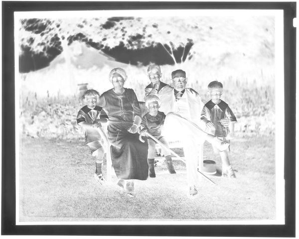 Curator: This is an Untitled image of a family group standing outside a house, held in the Harvard Art Museums, captured by Hamblin Studio. Editor: It's striking how the inverted tones create an otherworldly atmosphere, making the figures appear almost spectral. Curator: Indeed. The reversal transforms familiar iconography. Observe, for instance, the sailor suits on the boys— once symbols of youthful adventure and now lending an eerie sense of formality and lost innocence. Editor: The composition also reinforces this feeling. The subjects are rigidly posed, their faces almost devoid of expression, which contributes to the photograph's unsettling stillness. Curator: Yes, and the house in the background, though blurred, suggests stability, contrasting with the ephemeral quality of the inverted image. This tension speaks to the transient nature of memory and representation. Editor: I appreciate how the tonal inversions heighten our awareness of texture and form, almost forcing a reconsideration of photographic representation itself. Curator: An apt observation, suggesting the image is not merely a recording, but an active construction of meaning.