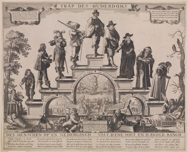 Curator: We are now standing in front of “Trap des Ouderdoms,” created sometime between 1612 and 1652 by an anonymous artist. It's an engraving currently held in the Rijksmuseum collection. Editor: It certainly has an intense, almost unnerving atmosphere, doesn’t it? The way life’s stages are rigidly depicted as steps feels so…controlled and predetermined. The use of line, the stark contrast, lends it an almost harsh quality. Curator: Well, think about printmaking in this period. Engraving was a painstaking, highly skilled craft. The process involved meticulous labor, the precise cutting of lines into a metal plate, the controlled application of ink and pressure. The resulting prints were relatively affordable, making complex allegorical images accessible to a wider audience than painted works could reach. This affected the popular consumption of this visual idea. Editor: Precisely! And consider what's being communicated. We see an allegorical stairway of life here, really reflecting the pervasive "memento mori" theme of the period. It presents life's stages, infancy to death. Look how social commentary on wealth, labour, and morality intertwines with anxieties about ageing and mortality! The composition itself visually reinforces power structures and prescribed societal roles at a given point in time. Curator: Absolutely. The figures stand rigidly on their respective steps, each seemingly consumed by their age-specific activity or condition. The print offers a didactic function, serving as a constant reminder of human transience for its contemporary viewers. This kind of precise craftsmanship meets symbolic, cautionary narratives to comment on life. Editor: The very medium reinforces this idea of predetermined paths; it's as though our fates are etched in ink. In this image we find a powerful reflection on mortality that questions individual agency and promotes a distinct set of societal values. It leaves me wondering about whose norms and beliefs are being propagated through mass reproducibility? Curator: Indeed, engaging with “Trap des Ouderdoms” challenges us to contemplate art-making techniques, social influences, and their effect on society and personal existence. Editor: I agree; confronting themes such as ageing, labor, social structures and the limitations they placed on individual lived experience is something this artwork instills in us.