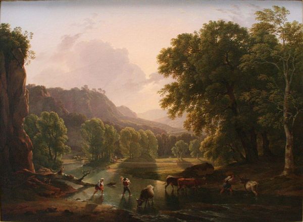 Curator: The tranquility radiating from this canvas is immediate. It’s as if the very air shimmers with warmth and a peaceful stillness. Editor: Agreed, and I think it's crucial to consider the socio-economic context when viewing such idyllic scenes. Aelbert Cuyp created this piece, "River Landscape with Horseman and Peasants," around 1660. While it captures a serene landscape, these scenes often functioned to reinforce a certain societal order. Curator: Ah, yes, that “Golden Age” of Dutch painting—not so golden for everyone, was it? Still, doesn't the composition pull you in? The way the light touches the distant mountains, creating such a dreamlike quality... Editor: Absolutely, and Cuyp’s skill is undeniable. Note how he uses light and shadow to create a hierarchy. The gentry on horseback are bathed in sunlight, while the peasants working are more muted. This isn’t just a landscape; it's a statement about social stratification. It’s an idealized, and perhaps romanticized, view of rural life. Curator: But, is that so different from any artist grappling with their present? He sees beauty and interprets, layers in those details of social existence—that hierarchy. I think there is beauty in this composition. I’m almost willing to close my eyes and swear I could smell the damp earth! Editor: And yet that beauty comes at the cost of erasure. The labor is present, certainly, but minimized, aestheticized. Consider who this art was for. The wealthy merchant class, eager to see their prosperity reflected back at them in art, perhaps even used to obscure harsher realities. These kinds of paintings weren’t cheap! Curator: Which makes you wonder what conversations *they* had when looking at this work. I'm still snagged on the painterly gesture itself – Cuyp’s touch. Look at those clouds, almost breathing. How do you reconcile beauty and the underlying issues that fuel creation? Editor: It’s the constant tension, isn’t it? Recognizing beauty while critically examining the power structures it upholds. A painting, like this one in the National Gallery in London, becomes a site of dialogue, between past and present, representation and reality. Curator: A place where art history speaks so profoundly, reminding us to see both the light and the shadows within a single frame.
