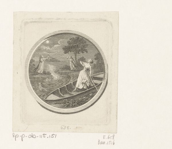 Daniel Nikolaus Chodowiecki created this print, "Jacob Sitting Under a Tree, in the Distance the Rising Sun," using etching techniques during an era of significant social and philosophical change. Chodowiecki, an artist of Huguenot descent, lived in a time when religious and cultural identities were often in flux. Here, the depiction of Jacob is not just a biblical reference but also an exploration of identity and resilience. Consider how Jacob's story – marked by struggle, displacement, and transformation – resonates with the experiences of marginalized communities. The rising sun symbolizes hope and renewal, yet the figure's posture suggests weariness, perhaps reflecting the emotional toll of his journey. Does this image represent a moment of quiet contemplation, or does it speak to a broader narrative of perseverance in the face of adversity?