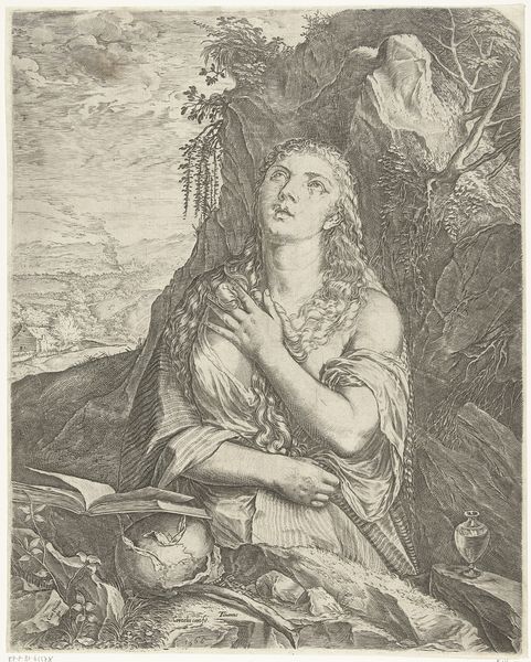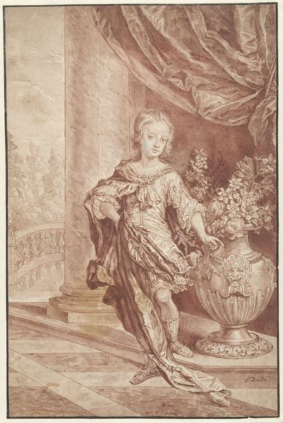 Curator: Welcome. Today, we’re examining Romeyn de Hooghe’s "Portrait of Mary Stuart," an engraving dating from between 1660 and 1708. Editor: It feels so constrained! The tightly-curled wig, the formal garden backdrop… even the abundance of flowers seem almost like a cage, rendered entirely in monochrome lines. Curator: The print, made using an engraving technique, offers a glimpse into Baroque sensibilities. It presents Mary Stuart, not merely as a person, but as a symbol laden with dynastic aspirations, a claim to the throne and perhaps much more! The garden symbolizes control, the taming of nature itself, just as a monarch tames their domain. Editor: But is it *her* choice? Her gaze, despite the formality, feels almost… melancholy? As if she's burdened by the very symbols meant to empower her. Those sleeves, like puffy clouds threatening a storm! Is she embodying power, or drowning in it? Curator: Consider how prints functioned then: multiples disseminated broadly. De Hooghe masterfully used figuration to convey her status, embedding heraldic motifs. It reinforces a preordained narrative, a carefully constructed persona for public consumption. The garden ornaments further reinforce classical allusions, which ties the lineage to grand European ambitions. Editor: It makes me wonder about the real woman versus the icon she was forced to become. Was her own identity deliberately cultivated or, rather, suppressed? She is positioned on a kind of ornate platform or pedestal – and, in essence, we are separated from her. Curator: The detail, though precise, leaves a sense of cool detachment, don’t you think? De Hooghe’s choices, and the conventions of Baroque portraiture, reveal much about the performance of power, and about the artist’s vision of status during this era. Editor: Definitely a sense of performance – power presented almost as theatre. It really brings to life the complexities and inner struggles buried within official portraits. Thank you for sharing this interpretation of Mary Stuart!