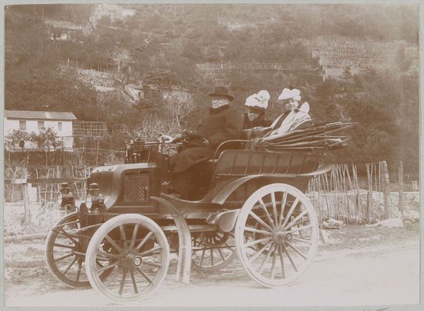 Curator: The sepia tones lend a real warmth to this photographic portrait from around 1900, titled “Twee mannen in een automobiel in Bar-le-Duc”. Editor: It's striking how much detail is captured in the men’s clothing; I almost feel the tweed of their jackets. And yet there’s also a kind of stillness about the composition. Curator: That stillness is interesting, particularly when thinking about the means of production. These early automobiles represented industrial advancement, wealth, and the very possibility of speed in a society still accustomed to horse-drawn carriages. Do you think the photographer, Delizy, was trying to mediate a tension between these new technologies and older traditions? Editor: I would suggest it could be a tension or perhaps it's capturing a pivotal moment. The contrast of light and shadow focuses the gaze directly onto the subjects; their postures tell of status. How aware were they, do you think, of presenting a new form of modern life to the world through photography, as opposed to simply documenting it? Curator: They are certainly performing modernity for the camera, but perhaps unaware that their performance would contribute to solidifying the automobile as an exclusive commodity rather than simply a new form of transport for the masses. It makes you consider how Delizy’s work participates in constructing these early images of progress. Editor: Right. And the composition itself emphasizes certain class markers; you have a somewhat rigid structure – vertical lines meeting circular forms, and the monochromatic quality directs us towards the nuances of expression on the men's faces and their social positions. I am more inclined to view the presentation of progress in its composition rather than the process of manufacture and marketing. Curator: Yet even in that controlled composition, the surrounding landscape, with the textures and randomness, plays an equally vital role by grounding the entire construction of the new in a social world in need of workers to operate machinery and purchase those newly available goods. It suggests that images of progress always have a background in real working life and labour. Editor: Well, our conversation definitely highlights the complexities embedded in capturing an era undergoing rapid transformation! Curator: Indeed; the photographic process and the end result each offer unique perspectives into an age of transition.