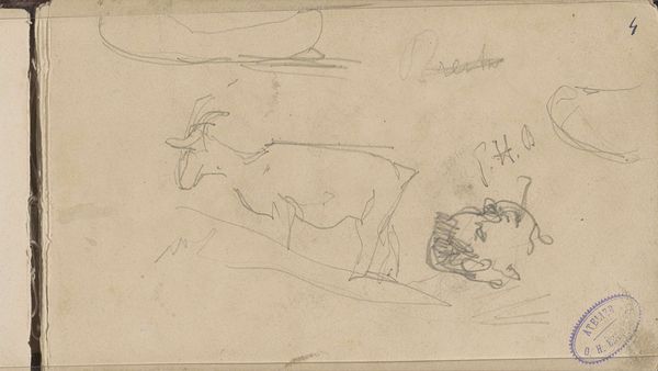 Editor: This drawing, "Twee liggende koeien in een weide," or "Two Reclining Cows in a Meadow," is attributed to Anton Mauve, dating sometime between 1848 and 1888. It’s done in pencil and watercolor on toned paper, and it feels so simple and unpretentious. What strikes you about this seemingly straightforward pastoral scene? Curator: What interests me is thinking about how art like this gets made during a time of such profound shifts in agricultural labor and land ownership. This work invites us to consider what the “natural” even means when it is constantly mediated through economics and power relations. Editor: Can you expand on that a little? I guess I always thought of landscapes as kind of apolitical. Curator: Well, who gets to own the land? Who gets to depict it? And for what purpose? These cows are resting, but what about the people who depend on them for labor, for sustenance, for profit? We have to consider the historical context: increasing industrialization in cities drove a romanticization of rural life. But for whom was this ideal actually accessible? Was Mauve engaging with or critiquing this shift in any way? Editor: That makes me look at it differently. The cows seemed peaceful before, but now I see them as possibly representing the kind of idealization that glosses over real struggles. Curator: Exactly. This tension between the reality of labor and the idyllic image is what makes the drawing resonate for me. What will you take away from our conversation? Editor: That even seemingly simple drawings can carry complex histories and critiques, waiting to be unpacked. Thank you.
