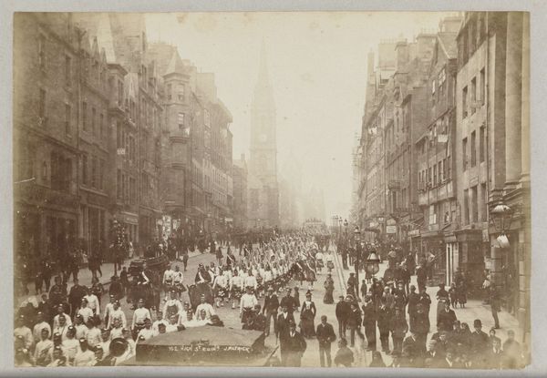Thomas Annan captured ‘Saltmarket from Bridgegate’ using photography, a medium that at once documents reality and manipulates its representation. The sepia tones create a muted palette, lending the scene a melancholic yet timeless quality. The composition draws the eye along the converging lines of the street, framed by the imposing architecture on either side. Annan's play with depth of field is particularly striking. The foreground figures appear blurred, almost ghostly, a contrast to the sharp detail of the buildings and the more defined group of people in the middle ground. This technique not only emphasizes the urban environment but also evokes a sense of transience. The formal structure reflects the social and philosophical climate of the time, engaging with ideas about urban life and the individual's place within the rapidly changing modern world. By using photography, Annan destabilizes traditional notions of representation, questioning what it means to capture a moment in time. This photograph invites us to consider how form and content intersect, challenging fixed meanings and opening new avenues for interpretation.
