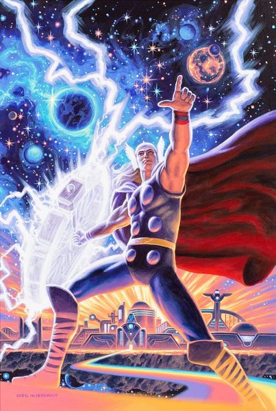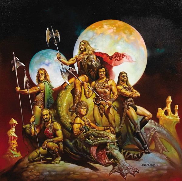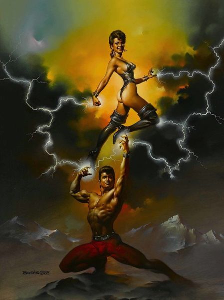 Editor: So, here we have Boris Vallejo’s 1985 oil painting, “National Lampoon’s European Vacation.” It’s quite a fantastical, exaggerated scene! I'm immediately struck by the… intensity of the composition. There’s so much going on, the eye really doesn’t know where to settle. What strikes you when you first look at it? Curator: Immediately, I note the composition's imbalance, a deliberate act by the artist, no doubt. The muscular figure dominates, and then all around him these landmarks jut haphazardly with their mist-shrouded landscapes. Note how the arrangement disregards conventional perspective: how does the relative scale of Eiffel tower in relation to the big man with luggage strike you? Editor: That’s definitely weird. The Eiffel Tower seems much too close and small, everything’s competing for space. Is the overall effect intentionally chaotic? Curator: Chaos might be too simplistic a descriptor. Observe the painting style. It almost screams 'allegory' – observe, also, the almost cartoonish quality to it all. The lightning bolts feel unnatural, no? Yet they provide an organizational key here: it is an allegory about both chaos and control, mediated by these surreal events depicted. Look closely and trace these fault lines. It is interesting how light seems to play with themes central both the surreal and allegorical! Editor: That’s a helpful way to think about it! So it’s not *just* a crazy painting but a meditation of opposing ideas clashing against one another using the medium? Curator: Precisely. The medium dictates and delivers its message, here. The forms themselves hold symbolic weight far beyond the face-value of a film backdrop or surrealist landscape. The lightning for example—its brightness illuminating… what, precisely? It’s a semiotic tool, wouldn’t you agree? Editor: Definitely something to ponder. Thank you. Now I can see beyond the initial “wackiness.” Curator: A worthwhile journey always involves multiple viewpoints. The wackiness as you termed it, as valid an entryway as any.