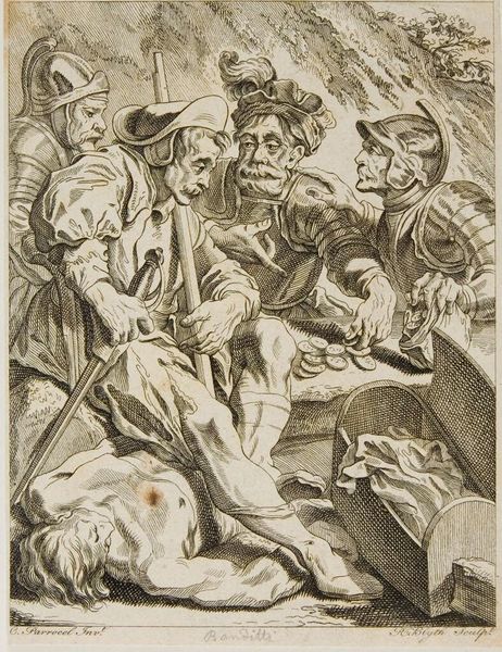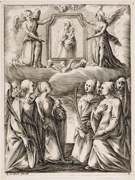 Editor: This is "The Aged Gathering Around the Angel of Death and a Skeleton" by Agostino Veneziano, created around the early 16th century. It's a pretty striking print. All these figures seem to be facing their mortality. What can you tell me about it? Curator: Well, look at the material—it's an engraving. This means the artist meticulously cut lines into a metal plate, forcing the printmaking process into existence through sheer labor. Notice how this allows for incredibly fine detail, emphasizing the decay and hardship of the figures. The social context of the plague years cannot be ignored either. Editor: So, the medium emphasizes the message? Curator: Precisely! The print medium itself made it possible to disseminate images of death and mortality widely, impacting how people consumed and confronted these anxieties. What do you make of that skeleton holding the skull? Editor: I guess art is all about process and how it affects society's view of mortality. Thanks! Curator: Absolutely, and don't forget the economic aspect of printmaking – art as a commodity.