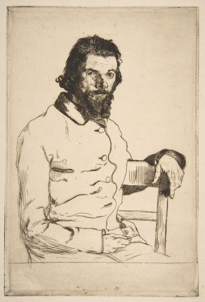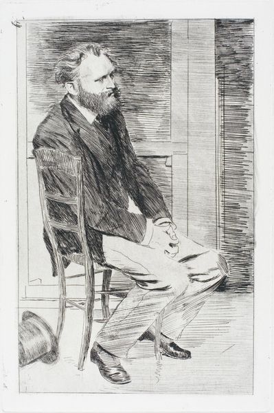 Edgar Degas made this etching, "Manet Seated, Turned to the Right," capturing his contemporary and fellow artist, Edouard Manet. Their relationship was complex, marked by mutual respect and creative rivalry amidst the burgeoning Impressionist movement in late 19th-century France. Degas renders Manet with a network of finely etched lines that create a sense of depth and shadow. Manet is captured in a moment of repose, turned away slightly, his hands clasped. The pose is informal yet dignified, offering a glimpse into Manet’s persona beyond his public image as a groundbreaking artist. What we see is not necessarily a portrait of power, but of quiet reflection. The lack of specific date invites us to consider the evolving dynamic between the two artists, and to view the etching as a statement of their evolving relationship. Degas's print is a testament to the intimate dialogues and silent observations that underscored their personal and artistic exchanges.