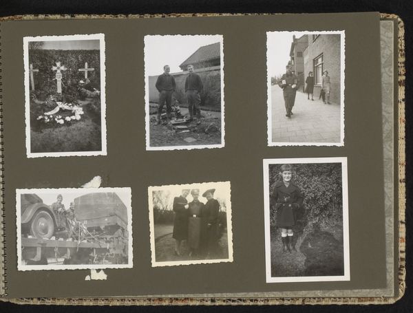 This is a page from a photograph album, its anonymous maker assembling images of military personnel in a landscape. The photographs create meaning through visual codes that refer to military life. The setting may be significant. Where and when were these photographs taken? The architecture, uniforms, and equipment might provide clues. Research into military history, photographic archives, and social history could help to determine that. The album page format itself speaks to a particular cultural practice of collecting and displaying personal memories. How does this private act relate to the public role of the military and the politics of imagery during that time? Understanding the social conditions that shaped the creation and circulation of these photographs can offer insights into their cultural and historical significance.