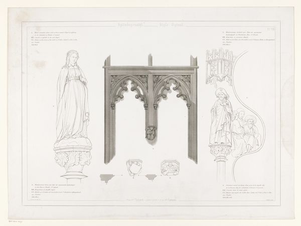 Curator: Here we have a drawing by Jacob Taanman of the wood carvings from an organ in the church in Naarden. The carvings themselves date back to around 1500. Editor: My first impression is one of precise detail and symmetry. The vertical panels are like mirrored reflections, and the subjects depicted within them seem rather stoic and posed. Curator: It's interesting you note the symmetry, as the original carvings would have been part of a larger, more complex whole. Each figure likely represented a saint, patron, or even a member of the donor family who commissioned the organ. Considering the period, this artwork acts as a snapshot into the rigid societal structure of the time and the roles individuals played within the church and broader community. Editor: I am also immediately drawn to the way that the lines define the textures. The heavy garments versus what appears to be metallic armor are cleverly conveyed, as is the ornamental detailing of the Gothic alcoves which frame the figures. Notice how this intricate framework accentuates the lines and contours. Curator: Indeed, and don’t ignore that these men are shown with what could be called trade tools. The ways that professions became symbols of family legacy within the broader story is relevant. Taanman captured a vital part of not just religious life, but socio-economic structures, too. I am also drawn to the fact that what might have been vivid painted colors in the wood carving is abstracted into line in this reproduction, adding an emotional element. Editor: The way Taanman uses line to depict the shift between shadow and light creates such subtle dimensionality on what is essentially a 2-dimensional medium. How this approach flattens the sculptural and spatial depths is masterful, especially since we see its graphic interpretation here on the page. Curator: In that sense, this piece is not just an isolated artwork. This drawing also invites us to consider broader questions about art and documentation, about how historical events are filtered through different hands and re-presented, sometimes generations later. Editor: It offers so many structural elements for study, as it emphasizes line, form and detail while highlighting texture, tonality and value through simple and balanced contrast. Thank you for shedding light on its layered context. Curator: My pleasure. Thinking about the individuals represented here prompts me to question how class and societal structures were being memorialized and what sort of roles were valorized at the time.