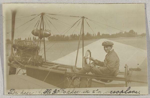 This is a photograph of Adolphe Pégoud in his airplane, made by A. Wyland. It's rendered in monochrome, a limited palette, which reduces the world to light and shadow. Look at the geometry of the plane, the network of lines crisscrossing through the air. It's fascinating to think about photography as a kind of drawing. Here the texture is created by the grain of the photographic paper, giving it a soft, almost hazy quality. The tones vary from deep blacks to subtle greys, creating depth and atmosphere. The lines of the plane’s structure remind me of a sketch. See how the artist uses these intersecting lines to create a sense of form and space? This image feels like a precursor to the experimental photography of someone like László Moholy-Nagy, who also explored the relationship between technology, space, and the human body. What do you see?
