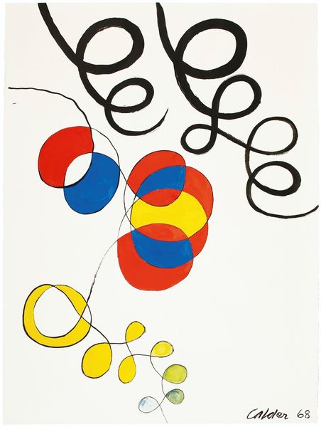 Alexander Calder created this gouache painting, "The Green Snake" in 1974, toward the end of his career. During the post-war period, art became less about literal representation and more about conveying movement and emotion. Calder, known for his innovative mobiles, brings this sensibility to a static, two-dimensional form. Here we see a playful, almost cartoon-like rendering of a snake, coiling above an arrangement of geometric shapes in primary colors. This snake, with its whimsical expression, deviates from the traditional, often fear-inducing representation of the animal, which we can find throughout Western art history. The simple, bold shapes and colors evoke a sense of childlike wonder, inviting viewers to engage with the work on an intuitive level. Calder’s distinctive style transforms these ordinary objects into something dynamic. The piece invites us to reconsider our relationship with the natural world. It balances on a knife's edge between seriousness and play, challenging us to find joy in the unexpected.