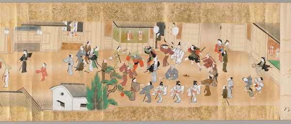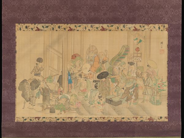 Editor: This print, "Acteurs in een shibaraku voorstelling" by Torii Kiyonaga, created between 1800 and 1804, feels incredibly dynamic. All the figures crammed into the frame really convey the energy of the performance. What can you tell me about the imagery and symbolism in it? Curator: The shibaraku scene itself is a powerful symbol. Think of it as a dramatic intervention, where a hero steps in at the last moment to save the day. That heroic figure, often depicted with exaggerated features and bold makeup, represents a kind of ultimate authority, right? The other figures, their costumes, their reactions – all feed into this central theme of justice and protection. Consider the composition itself – where does your eye go first? Editor: I'm drawn to the central figures, the actors in their elaborate costumes and makeup; they stand out due to their size and brighter colors, as they almost seem to leap off the toned paper. Curator: Exactly! The artist uses color and scale to emphasize the importance of the figures acting out Shibaraku, drawing our attention to what they represent. These are not simply individuals but archetypes, echoing historical and mythological figures that resonate deeply within Japanese cultural memory. Notice also the subtle gestures and facial expressions. What do they communicate to you? Editor: There's a mix of emotions – fear, awe, anticipation… It feels like a frozen moment of high drama, encapsulating the performance’s whole narrative arc. Curator: Precisely. These elements construct a symbolic world. Kiyonaga taps into a well of shared cultural understanding, creating a visual shorthand that communicates complex ideas about power, justice, and societal harmony through very familiar imagery. Are there particular elements that stay with you? Editor: It's fascinating how much cultural context is embedded within seemingly simple visual cues. Now that you point it out, it's difficult to see just the costumes, acting, or illustration of performers but the rich cultural implications behind their presentation. Curator: The layers of symbolic meaning enrich the viewing experience, encouraging us to look beyond the surface and contemplate the enduring themes embedded within this dynamic performance.