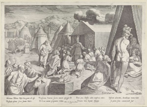 Curator: Here we have a fascinating print: "The Procession of the French in Utrecht, 1672," created anonymously between 1672 and 1674. It’s a rather detailed engraving. Editor: My first impression is how the high-contrast line work really draws the eye across the whole composition, yet somehow leaves a feeling of stark… displacement. It’s quite a formal rendering, though! Curator: Displacement, yes, fitting for a historical document showing a conquering force occupying a city. Note how the artist used varying densities of line to articulate depth and create a sense of receding space, particularly in the crowd. Semiotically, the cobblestones direct the viewer's gaze toward the invading military presence. Editor: Indeed. The image pulses with visual symbolism—the religious banners held high, the bowing figures, and the French soldiers with their elaborate weaponry… These elements converge to underscore French dominance. What do you make of the men sweeping the ground? Is this some gesture of imposed subservience? Curator: Precisely. This act becomes a formal device underscoring power relations within the representational space of the engraving itself, through the contrast of movement of the broom to the erect spears and vertical composition that is on display elsewhere in the artwork.. It reminds one of classic landscape composition with high and low points that mark formal emphasis. Editor: And how the building to the right nearly eclipses the religious parade! Almost like they have claimed it. Considering cultural memory, this procession becomes a powerful symbol of a subjugated Utrecht, forever imprinted in visual form, in this case a moment in the Franco-Dutch War. It is also clearly of a moment, considering how quickly clothing changed during this era. Curator: Certainly, and even today it reminds the viewer of that subjugated history of Utrecht through its baroque aesthetic and visual impact; notice how the light-dark shading models depth throughout the image. The interplay emphasizes key visual symbols and underscores its ideological intention. Editor: Ultimately, it’s a disquieting record – that's captured not just the event, but its lasting symbolic significance on our modern understanding of conquest, as well as Baroque-era values of the day.. Curator: I agree. The composition remains compelling for what it says about history, its structure, its lines and shading—offering continuous opportunities for engagement.