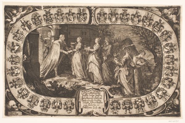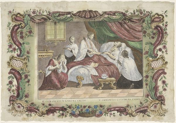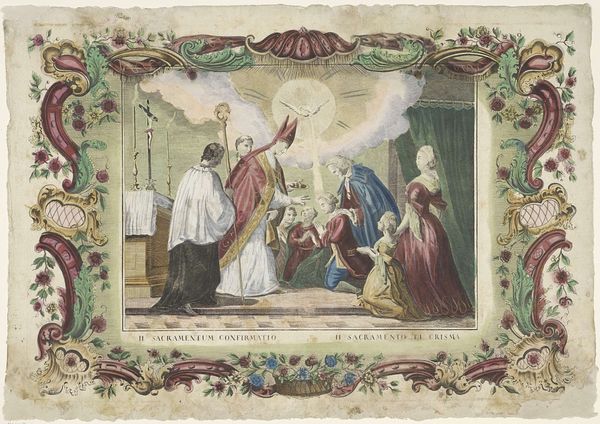 Editor: This is "Presentation of Christ in the Temple," an 18th-century watercolor by Giovanni Volpato, held at the Rijksmuseum. It's so ornate! I’m immediately struck by the heavy decoration, especially that border with flowers and what looks like theatrical draping. How would you interpret this work, particularly in its historical context? Curator: This print reflects the socio-political role of religious imagery in the 18th century. Prints like this, even with watercolour additions, made religious narratives more accessible. Consider how the decorative frame and the Baroque style amplified the drama, not just for aesthetic pleasure, but to visually reinforce religious doctrine to a wider public, many of whom may have been illiterate. Note how the very theatrical staging helps? Editor: So, the art isn’t just *depicting* a scene; it's trying to shape belief through visual rhetoric? Curator: Precisely. Think about the institutions that would have supported the creation and distribution of works like this - the Church, of course, but also print workshops and individual patrons. What stories were they trying to tell, and to whom? What did "access" to such an image do in that time and place? Editor: I hadn’t really considered how prints democratized art in this way. It’s like an early form of mass communication. It really changes how I see it. Curator: And, of course, we, today, stand at a considerable distance from the time of its creation, which affects our interpretation. It also prompts questions of its legacy, influence, or how the piece was perhaps later displayed, acquired, and presented, all elements of a fascinating, ongoing story. Editor: I learned a lot about how artworks act as both devotional items and historical documents. Curator: Indeed, reflecting complex societal beliefs, institutions, and technological changes. Thank you.