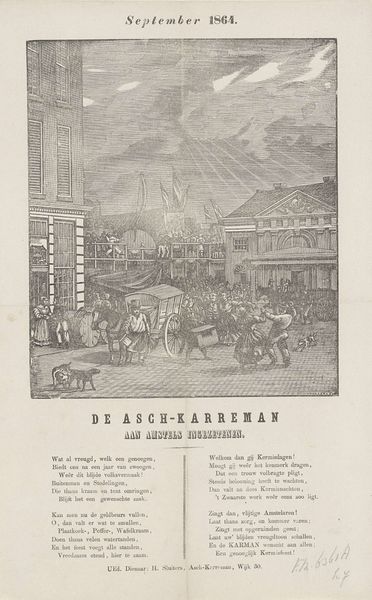 Editor: Here we have "Kermisprent van de Amsterdamse askarrenmannen voor het jaar 1844," or "Carnival Print of the Amsterdam Ash Cart Men for the year 1844," an engraving from 1844. It feels very much of its time – a glimpse into working-class life in Amsterdam, perhaps a bit idealized? What do you see in this piece? Curator: Immediately, I’m drawn to the materiality of this print. It’s an engraving, which means it was likely reproduced en masse. Who was the intended audience and what does that tell us about consumption patterns at the time? Notice the presence of both the image and the text; what social dynamics existed when an entire trade was represented via material like paper? Editor: So you’re thinking about the context in which it was made, how the print medium itself connects to social class. I hadn't considered it that way. Curator: Precisely. How does it relate to the labor and materiality of producing the image? This wasn't 'high art' intended for the elite, right? How do we interpret the portrayal of labor; can we even grasp the actual process from observing an engraving? Was it to show their pride? Perhaps a way to solicit better treatment, or tips? Editor: The print almost feels like a promotional item then? A form of self-advertisement or maybe even a plea for recognition. Curator: Yes, a form of commodity, absolutely. Look at the cityscape in the background, contrasted to the text beneath, seemingly "explaining" the workers. We might even think about this as a form of early marketing and how print facilitated these new commercial relationships. What kind of value was being produced here, for whom, and how? Editor: I didn’t expect to think so much about economics looking at this. Thanks, it’s given me a whole new way of looking at historical prints! Curator: Indeed, seeing art through the lens of material production can be so enriching!
