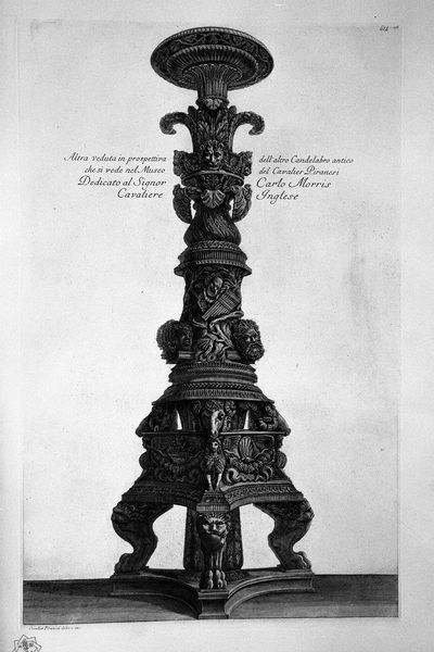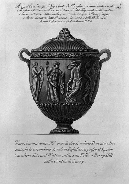 Curator: Giovanni Battista Piranesi created this print of an antique marble vase with intertwining vines, pine, and a wolf figure. Editor: It looks severe, like something out of a dream…a dream of marble and shadowed forests, perhaps. Curator: Piranesi was a master of etching and engraving, and this piece really showcases his skill in capturing the textures and intricate details of the vase. Notice the layering of vines and pinecones, giving a sense of depth and volume. Editor: I am struck by the figure of the wolf. Its stance, so calm against the ornate vessel... it feels deliberate. Like nature asserting itself. It's oddly beautiful, though in a somewhat unnerving way. Curator: That interplay is interesting, isn’t it? The sculpture is from Cardinal Albani’s Villa. Piranesi captures that tension—between nature and culture. The vase itself, the perfect emblem of refined tastes. Then we have nature pushing its way through, and that fierce wolf walking within the frame. Editor: Exactly. The Baroque period loved this sort of theatrical display, didn’t it? Vines clambering, objects twisted… Piranesi really leans into the movement and ornamentation to explore it. This single work can be considered almost overwhelming. I imagine the scale of the sculpture is what provides that impression. Curator: The contrast is heightened by Piranesi's dramatic use of light and shadow. It gives the vase this incredible three-dimensional presence. It almost feels as though we could reach out and touch it. This particular print, you know, was made to honor an English admirer of fine arts, Asheton Curzon. It highlights Piranesi’s practice, of course, of selling artwork to British Grand Tourists visiting Rome, almost as a business. Editor: Considering the level of detailing across all these textures of marble, vines, and fur, the wolf becomes the focal point— it commands this composition by the mere concept of what the beast is. Curator: Piranesi manages to encapsulate whole themes of wilderness with marble artifact so successfully. What an interesting perspective that is: from artwork, to artifact, and then nature… it creates an illusion of infinity! Editor: Agreed, its presence is unforgettable and prompts conversations around history and craft; a truly exceptional piece from Piranesi.