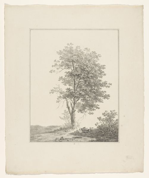 Curator: Right, let's dive into this rather serene work. What strikes you first about this pencil drawing? Editor: Hmm, well, right away I’m drawn to the tree itself, this sort of lonely sentinel dominating the space. There’s something melancholic about it, but peaceful, you know? Curator: I do. This is “Parti fra en have,” or "View from a Garden," a work by Christen Købke, created in 1846. We find it now in the collection of the SMK, the National Gallery of Denmark. Considering Købke’s milieu, think about the role gardens played within 19th-century bourgeois culture. The garden, of course, acts as an intersection where nature and culture converge. Editor: Yes! That contrast hits me too. You have this meticulously rendered, almost photographic tree against the faintest wash of, well, "otherness" – what's lurking beyond the fence? Is that a church? It's like a half-remembered dream behind the imposing tree. Curator: Absolutely. Köbke’s art emerged during Denmark's Golden Age. What he accomplished with simple pencil strokes is to offer viewers the capacity to connect with place, but simultaneously hinting at what exists on the edge, the periphery. Köbke’s piece uses the trope of Romanticism yet veers towards realism, particularly in the foreground with this single tree placed strategically as a lens to look at a garden scene. We are placed, as viewers, as a part of the composition, situated perhaps at the window from the interior. Editor: Right, the detail is captivating, the textures almost palpable. It feels as though I can sense the rough bark and the delicate leaves all at once. But it's the scale that really intrigues me, it gives this little slice of nature monumental weight. Curator: It does ask questions about our place in the world. Thinking about today’s context, it resonates with urgent questions around sustainability, climate change and the interplay between built environments and our connections with nature. Editor: Looking at the pencil lines I see a beautiful sense of longing... I can almost hear the breeze whispering through the leaves. Curator: Agreed. This drawing by Köbke, even in its simplicity, serves as an important historical signifier of how we think about the representation of the natural world. Editor: Yes, that whispering breeze really helps bring to life all the possible histories, from the intimate and local, to a larger cultural understanding about place and identity.