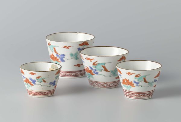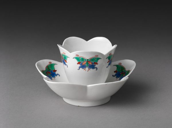 Curator: Here we have a "Cup and saucer," dating from 1725 to 1735 and made by the Meissen Manufactory. The set is currently held at the Metropolitan Museum of Art. It’s rendered in porcelain and showcases aspects of Rococo style. Editor: Isn't it lovely? It’s like a fleeting moment captured in porcelain. So delicate and charming! A tiny world painted on something so small and precious. It makes me think of secret rendezvous and stolen kisses. Curator: Indeed. Let's consider the forms at play. The set is not merely functional but sculptural. Notice the molded, lobed edges and the asymmetry inherent in the painted decoration. These attributes are emblematic of Rococo art, defying strict geometrical order in favor of dynamism. Editor: Absolutely. That playful asymmetry dances across the pristine white canvas, creating such visual pleasure! The gentle curves soften what could've been angular, giving the whole set a flirtatious energy. I find myself utterly charmed. Curator: Consider, too, the deployment of color. The restrained palette accentuates the white porcelain body, enhancing the tactile quality of the pieces. Observe that the orange bird contrasts against the neutral ground, drawing the eye and directing our reading of the piece as a whole. The rendering of the foliage, using orange, green, and blue, adds subtle but enriching tones. Editor: The brushstrokes on the bird have an immediacy; it looks as if the bird could take flight right off the plate! I like to imagine who painted that, maybe humming while working to create that whimsical world, adding such beauty to a functional object. Curator: We can deduce much by the careful study of details. These details showcase a masterful grasp of material properties. Porcelain allowed for incredible detail but was still able to retain fragility and translucence. Editor: For me, porcelain sings with elegance, capturing the artful balance between nature and human expression. Gazing at this little cup and saucer offers more than meets the eye. It connects you to history with every detail, telling silent, potent stories.