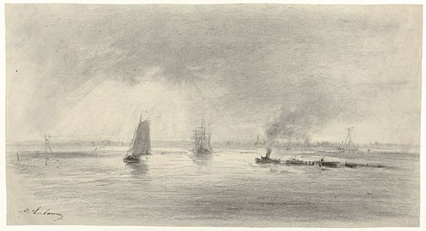 Curator: Allow me to introduce David Cox’s c. 1832 watercolor, "Dieppe Pier, Stiff Breeze." Editor: What a bracing scene! It certainly captures the feeling of a blustery day by the sea. The palette is so restrained, almost monochromatic. Curator: Indeed. Cox has skillfully used washes to depict light and atmosphere, structuring the composition through layered applications of color. Notice how the horizon line is kept low, emphasizing the drama of the sky and the choppy water. Editor: And the symbolism inherent in a port scene like this! The ships themselves become emblems of journeys, departures, and returns. Dieppe, being a channel port, carries specific cultural resonance as a place of transition and exchange between England and France. Curator: Note also the strategic placement of figures on the pier. The implied diagonals leading back into space invite the viewer’s eye deeper into the composition. These small figures add scale, accentuating the vastness of the sea. Editor: They remind us, too, of humanity’s relationship to the sea – a mixture of reliance and vulnerability. The seabirds further enhance this emotional and environmental landscape of wildness. It is interesting that Cox leaves a blank spot to let the watercolor be expressive. It reminds one of ruins. Curator: That brings an interesting interpretive tension, because although this Romantic landscape encapsulates the sublime through suggestions of drama and ephemerality, the technical structures of pier and ship reflect humanity’s resilience. The watercolor offers us something beyond straightforward representation, but hints at an experience, a felt and embodied sense of place and being. Editor: Cox offers us an atmospheric perspective on a fleeting moment. I love to contemplate all that symbolism captured in simple lines and watery washes! Curator: I see his masterful composition allowing this small watercolor on paper to hold so much presence. It’s a remarkable example of implied form created with minimal strokes.