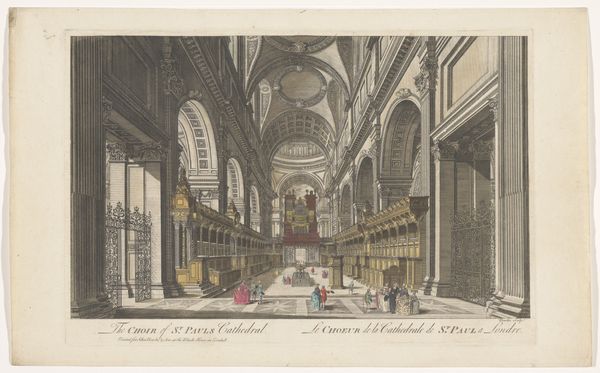 Daniel Havell created this print, "Interior of Christ Church," using etching and aquatint. The composition is dominated by vertical lines of the columns which recede into space, met by horizontal bands of seating and the overhanging balcony. These structural elements intersect with the curves of the arched ceiling, creating a dialogue between the rigidity of architectural form and softer, organic shapes. The limited palette focuses on the contrast between the muted browns and whites of the architecture, drawing the eye upward. The figures at the bottom introduce a human element but are secondary to the grandeur of the building itself. Here, Havell explores how architecture dictates social space and experience. The church is not merely a building but a structured environment shaping behavior. The print thus asks us to consider how our surroundings influence our perceptions and interactions, suggesting architecture as a silent but powerful form of communication.