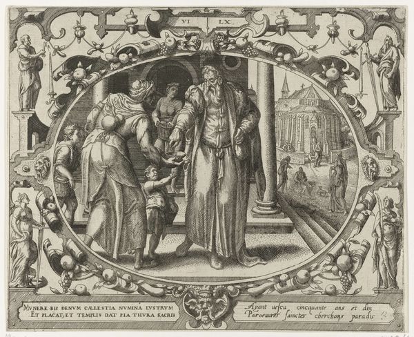 Curator: Let's discuss "Judith Goes to the Camp of Holofernes," an engraving from around 1575 by an anonymous artist, part of the Northern Renaissance tradition. My first impression is how compartmentalized everything is. Each section seems carefully delineated, creating a sequence or layered narrative. Editor: Exactly. The division into discrete spaces highlights a temporal progression. It’s not just about surface aesthetics, though. Consider Judith as a figure—she steps forward to represent a crucial moment of resistance to masculine aggression, an archetype of defiance and strategic feminine power during wartime. The story highlights intersectional relationships among gender, power, and national security in a time of immense social and religious upheaval. Curator: I agree; the composition draws our eyes sequentially. From the council to her act of faith to the fateful encounter. The visual elements, such as the linear perspective and use of colour, seem to guide us methodically through each act of Judith's narrative. Editor: And each step serves a clear cultural objective—reinforcing not just religious tropes but prevailing social ones as well. The print cleverly integrates Judith’s personal conviction into the broader implications of patriotic symbolism during the late Renaissance. Do you agree? Curator: Partly. While I do value that broader thematic analysis, I think looking simply at the composition—its deliberate sequencing and controlled chaos—provides invaluable insights into the symbolic intent. Every detail matters, from architectural framing to facial expressiveness. Editor: Indeed. But for me, those details exist only to illuminate the very timely topic of women in positions of influence—navigating the socio-political expectations inherent in early modern Europe and continuing into modern culture. What does it really cost us to focus on form? Curator: Well, by analyzing form, we can then unpack cultural associations like gender, social standing and other intersecting identities represented through color, material or composition. By emphasizing details like the ornate, colorful trim of her dress or other markers, these attributes start to solidify cultural contexts beyond face value. Editor: Agreed, though those contexts and social meanings were, of course, the driving force behind it. Curator: Perhaps. Yet through studying formal strategies, we begin to comprehend just how this print has come to have power—what semiotic attributes or intentional patterns led it to resonate for so long. Editor: Absolutely, I've gained a sharper vision by recognizing how art historical forms enable such charged issues—religious authority and patriarchal expectations in a world on fire!
