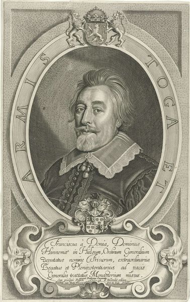 Coenraet Waumans made this print of Jacob Lampadius, likely around the mid-17th century, using engraving techniques. It presents Lampadius within an elaborate oval frame, adorned with heraldic symbols, reflecting the conventions of portraying individuals of high status at the time. Prints like this one served a crucial role in disseminating images and ideas in the Dutch Golden Age. The symbols are visual codes that speak volumes about Lampadius's lineage and the cultural values that supported the social hierarchy. The text surrounding the image makes reference to historical associations. Waumans was working within a well-established system of patronage and artistic production. Understanding this print requires us to consider the social and institutional contexts that shaped its creation and reception. By exploring archival documents, genealogical records, and art market data, we can gain insights into the print's significance as a marker of social status, a tool for political influence, and an object of cultural exchange.
